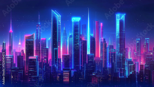 Obraz premium Vibrant Futuristic City Skyline at Night with shiny and glowing neon lights, abstract ultra modern light effect of cityscape featuring sleek modern architecture illuminated by vibrant neon lights.