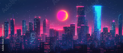 © INT888, Obraz premium vibrant futuristic cityscape at night with neon lights and glowing moon
