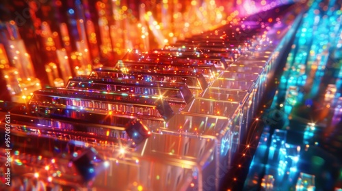 © Waraporn, Obraz premium Vibrant Futuristic Neon Abstract Background with Luminous Digital Lights and Electricity Sparks Dazzling Matrix of Colorful Glowing Shapes Patterns and Geometric Designs in a Hypnotic