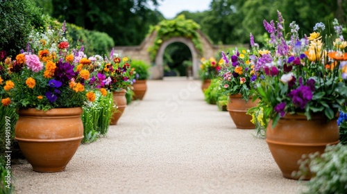 Naklejka premium Vibrant garden display of terracotta pots filled with mixed seasonal flowers