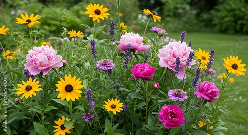 Fototapeta premium Vibrant garden of colorful flowers blooming in natural sunlight