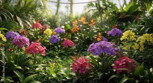 Fototapeta premium Vibrant garden with colorful flowers and butterflies in lush greenery