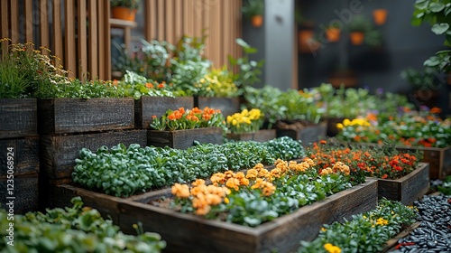 Fototapeta premium Vibrant garden with colorful flowers in wooden planters, showcasing a serene...