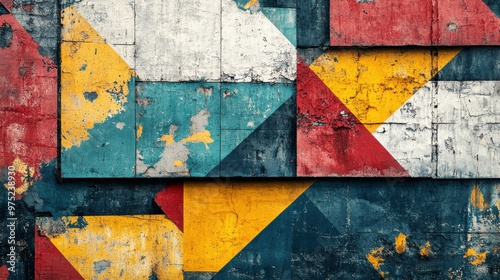 © diowcnx, Naklejka premium Vibrant Geometric Mural with Brick Wall Background and Abstract Shapes in Red Yellow Blue Green.