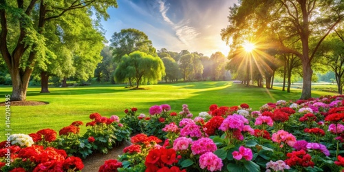 © Nasnunt, Fototapeta premium Vibrant geranium flowers surround a lush green grassy area in a serene park setting with blooming trees and sunshine, greenery, garden view
