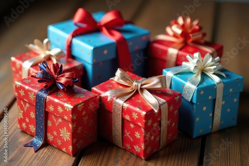 © AMZi StudiO, Fototapeta premium Vibrant gift boxes, satin bows, rustic wood table, colorful, bow, gift