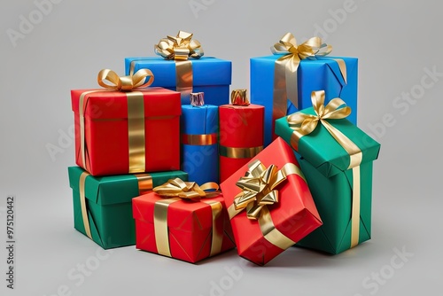 Fototapeta premium Vibrant Gift Wrapped Presents in Red Blue Green with Gold Ribbons on Isolated Background