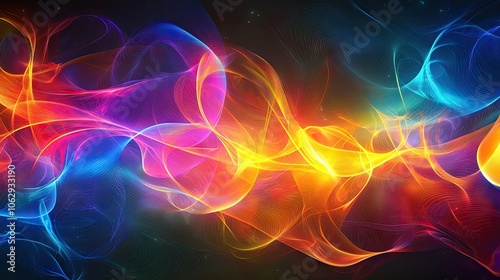 Fototapeta premium Vibrant glow waves create a captivating abstract pattern on a dark background, providing a colorful and dynamic visual experience with ample space for design elements.