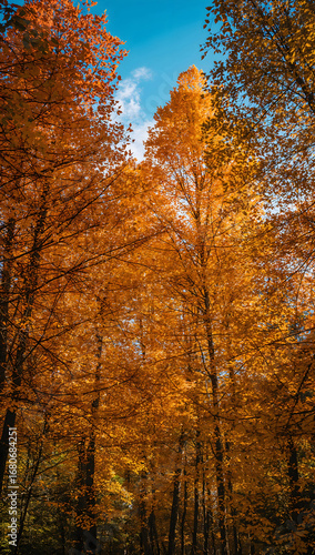 © ريحان, Fototapeta premium Vibrant golden autumn forest canopy against bright blue sky fall trees