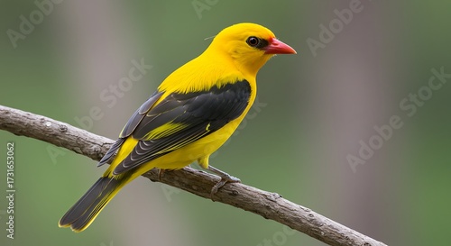 © Geyol, Fototapeta premium Vibrant golden oriole bird perched on branch in nature environment