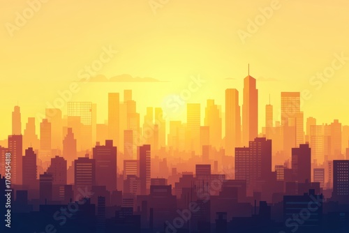 Naklejka premium Vibrant golden skyline at sunset showcases stunning urban architecture and...