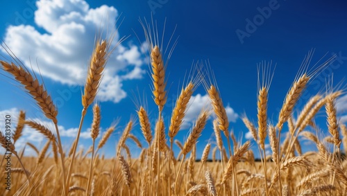 Fototapeta premium Vibrant golden wheat field under a bright blue sky with fluffy clouds in a...