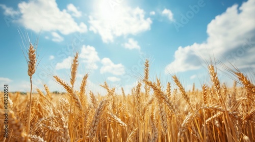 Fototapeta premium Vibrant golden wheat field under a sunny blue sky with fluffy clouds