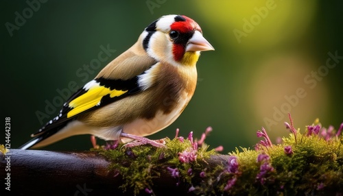 © netsay, Obraz premium Vibrant Goldfinch Perched on a Sunlit Winter Branch, Amidst a Frosty Landscape, in a Striking Monochrome Palette.