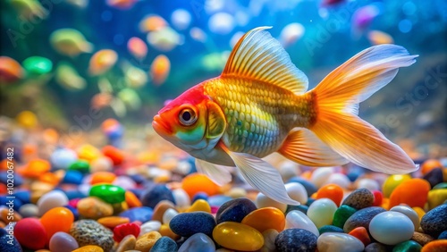 © Danicha, Fototapeta premium Vibrant Goldfish Swimming Gracefully in Clear Aquarium Water with Colorful Decorative Stones Below