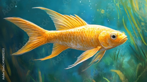 © PANINN 369, Fototapeta premium Vibrant Goldfish Swimming Gracefully Underwater Surrounded by Aquatic Plants and Bubbles in Clear Blue Water