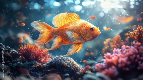 Fototapeta premium Vibrant goldfish swims amidst coral reef.