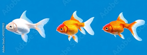 Naklejka premium Vibrant Goldfish Trio Isolated Against Solid Blue Background for Aquarium or...