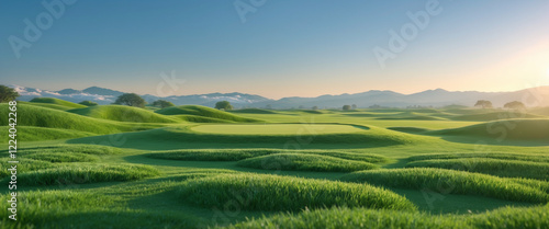Fototapeta premium Vibrant golf course landscape with lush green grass, rolling hills, and a serene mountain backdrop under soft sunlight.