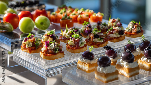 © Muhammad, Naklejka premium Vibrant Gourmet Canaps and Fresh Fruits on Modern Clear Display for Catering Event
