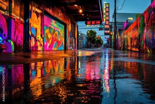 © kucret, Fototapeta premium Vibrant graffiti alley reflection, urban night scene
