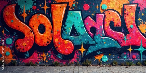 Naklejka premium Vibrant Graffiti Art Featuring Bold, Swirling Letters on a Textured Wall,...