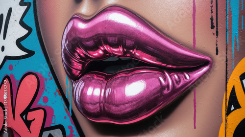 Fototapeta premium Vibrant graffiti art featuring glossy pink lips with playful expression, showcasing urban creativity and bold colors