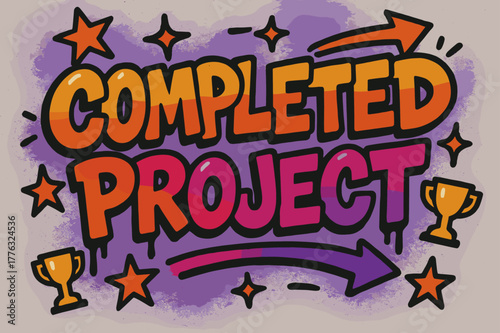 © Coosh448, Obraz premium Vibrant Graffiti Art. Graffiti Simplified ? "Completed Project" in thick bubble letters, tilted dynamic layout, dripping outlines, flat spray fills, arrows,