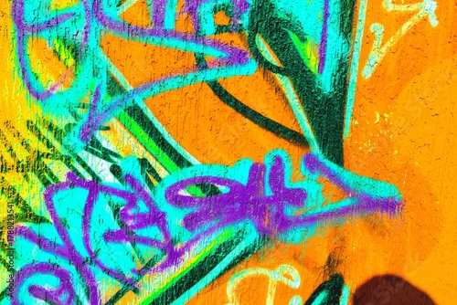 Naklejka premium Vibrant graffiti art in neon purple, turquoise, orange. Retro 80s style, bold colors, dynamic patterns. Street art, urban design, digital backgrounds, modern 80s visuals.