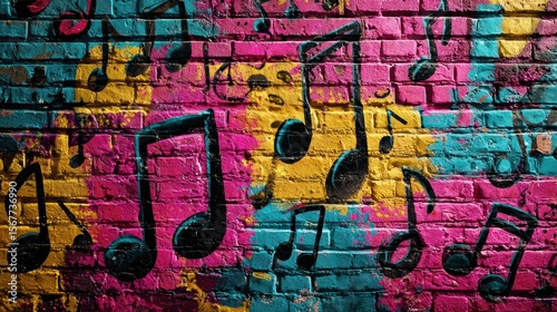 © Alohanongza, Fototapeta premium Vibrant graffiti art of musical notes painted on a colorful brick wall with pink, blue, and yellow splashes.