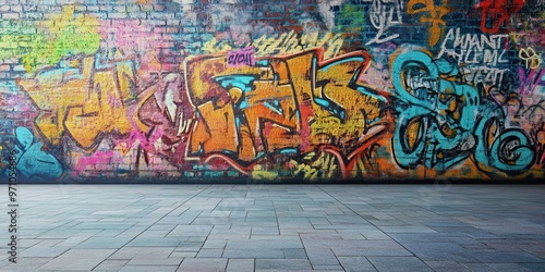 © kiimoshi, Fototapeta premium Vibrant graffiti art on a wall, showcasing colors and urban creativity in a lively street setting.