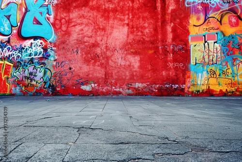 Fototapeta premium Vibrant graffiti on a red brick wall with a cracked asphalt ground,...