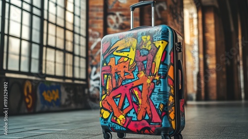 Fototapeta premium Vibrant Graffiti Suitcase Stands In Urban Setting