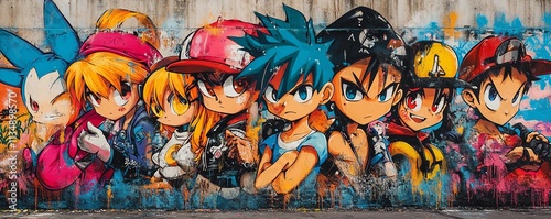 Fototapeta premium Vibrant graffiti wall with bold cartoon anime characters, colorful street art style, dynamic poses and graffiti lettering, urban aesthetic, energetic atmosphere