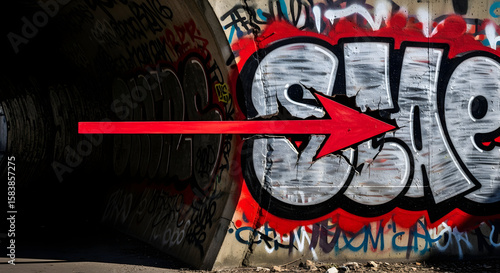 Obraz premium Vibrant graffiti with a bold red arrow pointing from darkness to artistic expression and urban creativity