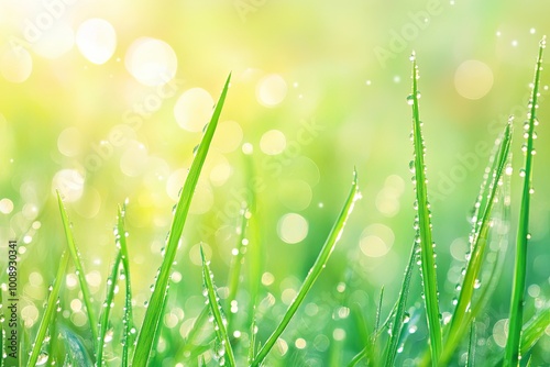 Fototapeta premium Vibrant grass blades glisten with dew under warm sunlight, creating a...