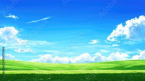 Obraz premium Vibrant grassy field under a clear blue sky with fluffy white clouds, perfect...