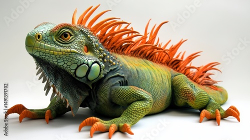 © thenort, Obraz premium Vibrant green and orange iguana sculpture, detailed texture and pose.