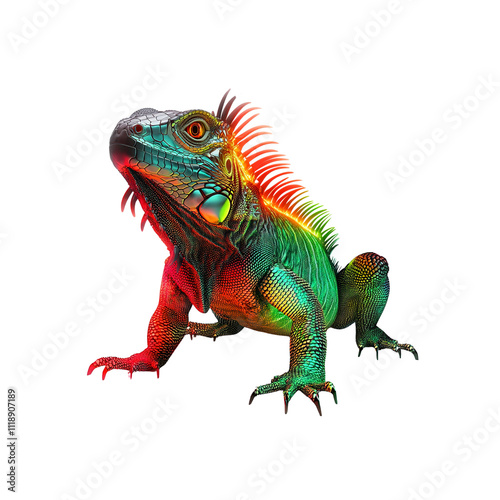 © PixelGen, Obraz premium Vibrant Green and Red Iguana with Colorful Scales, Isolated on White Background