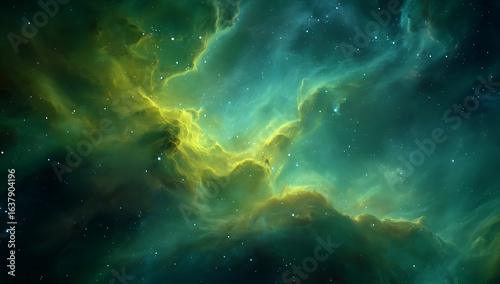 Fototapeta premium Vibrant green and yellow nebula clouds with scattered stars in deep space...