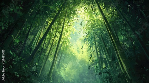 Naklejka premium Vibrant green bamboo stalks in a tranquil forest, stretching high into the sky and creating a peaceful, nature-filled ambiance