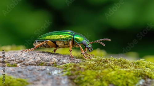 Naklejka premium Vibrant green beetle crawling on mossy surface in natural habitat