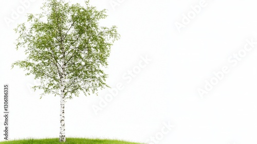 Fototapeta premium Vibrant Green Birch Tree on Lush Grass Against a Bright Background