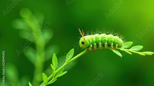 © BokehBox, Naklejka premium Vibrant Green Caterpillar Crawling on a Lush Green Plant Stem in a Natural Setting