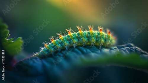 © muhamad, Naklejka premium Vibrant Green Caterpillar Crawling on Leaf