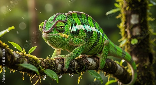© sugeng, Obraz premium Vibrant Green Chameleon Perched on Mossy Branch, Rainforest Habitat, Close-up.