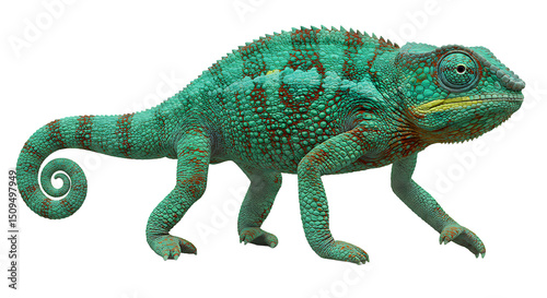 © MBAK NAH, Obraz premium Vibrant Green Chameleon with Intricate Scales and Spiral Tail