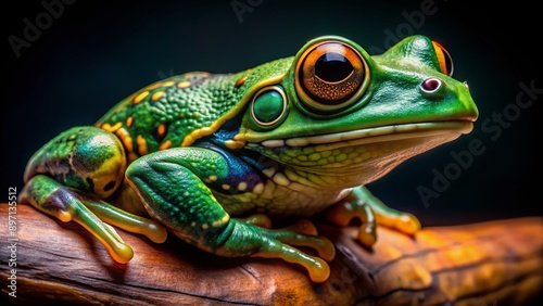 © Four888, Obraz premium Vibrant green exotic frog with intricate skin texture and golden eyes perches on dark background, showcasing its natural beauty in stunning close-up detail.