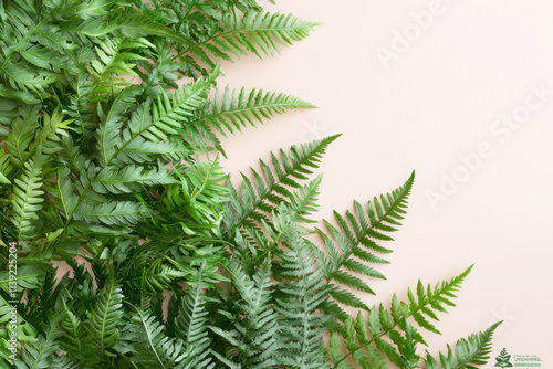 © Nakorn, Naklejka premium Vibrant green ferns close-up pastel pink background nature photography detail focus serene viewpoint botanical concept