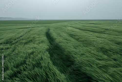© li ying, Naklejka premium Vibrant green field swaying gently in the wind on a cloudy day